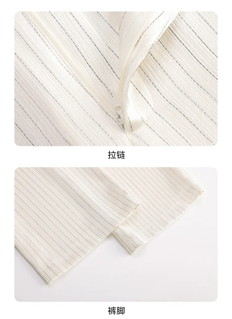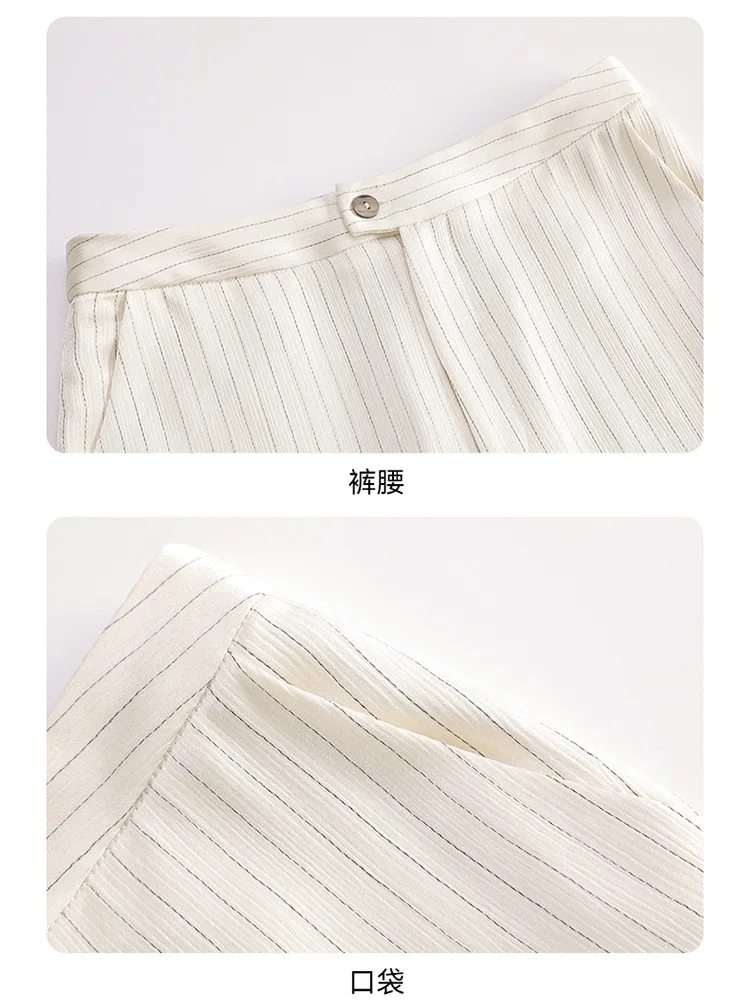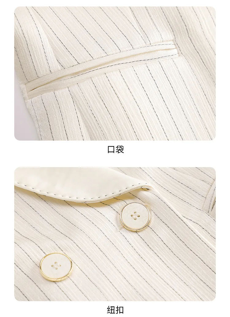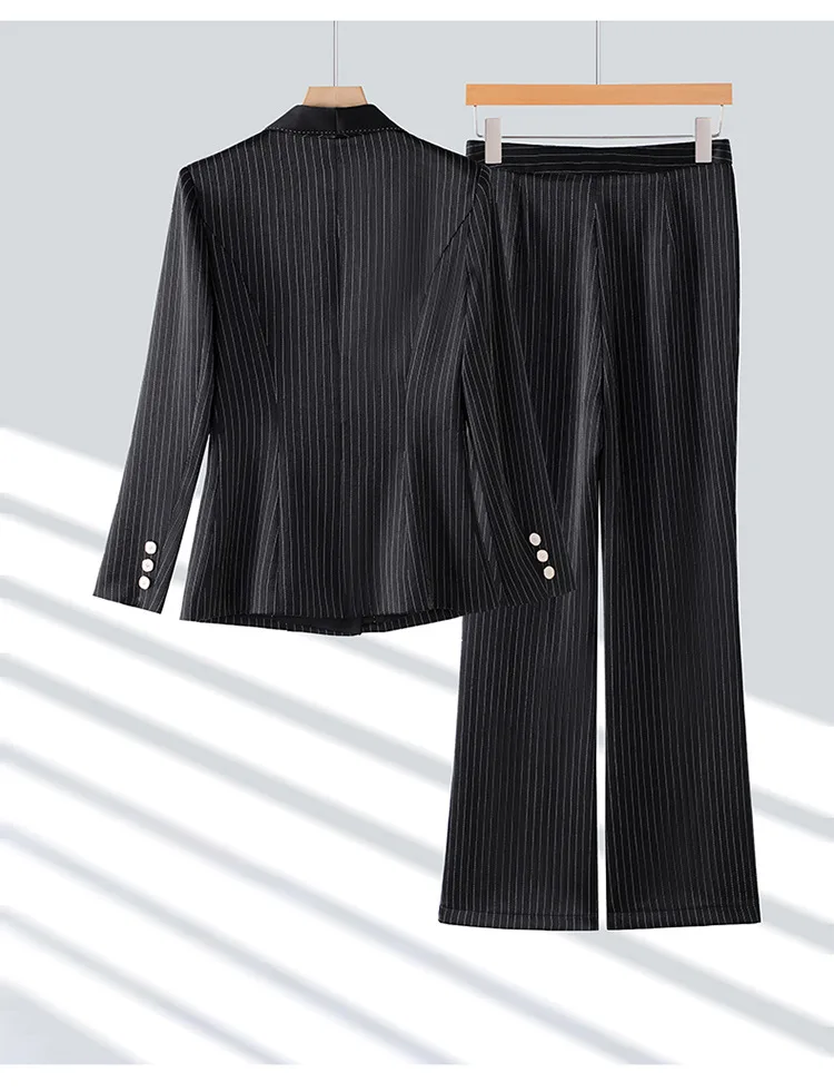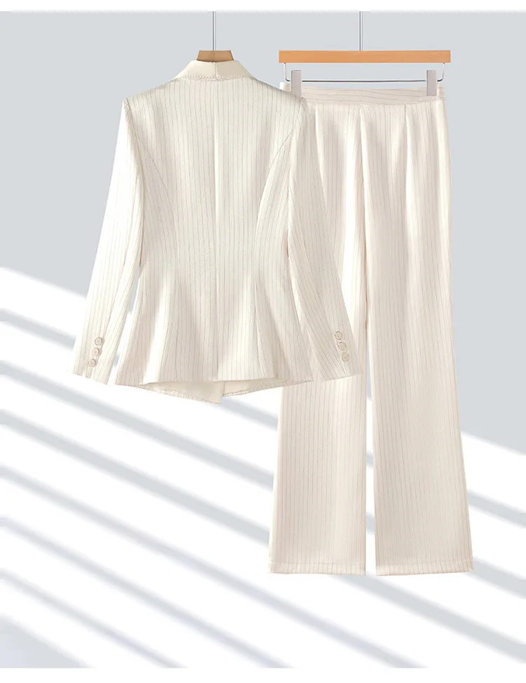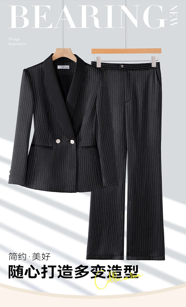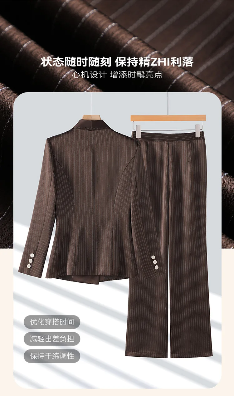 The slim cut blazer and pencil pants combination exude professionalism, perfect for office environments.