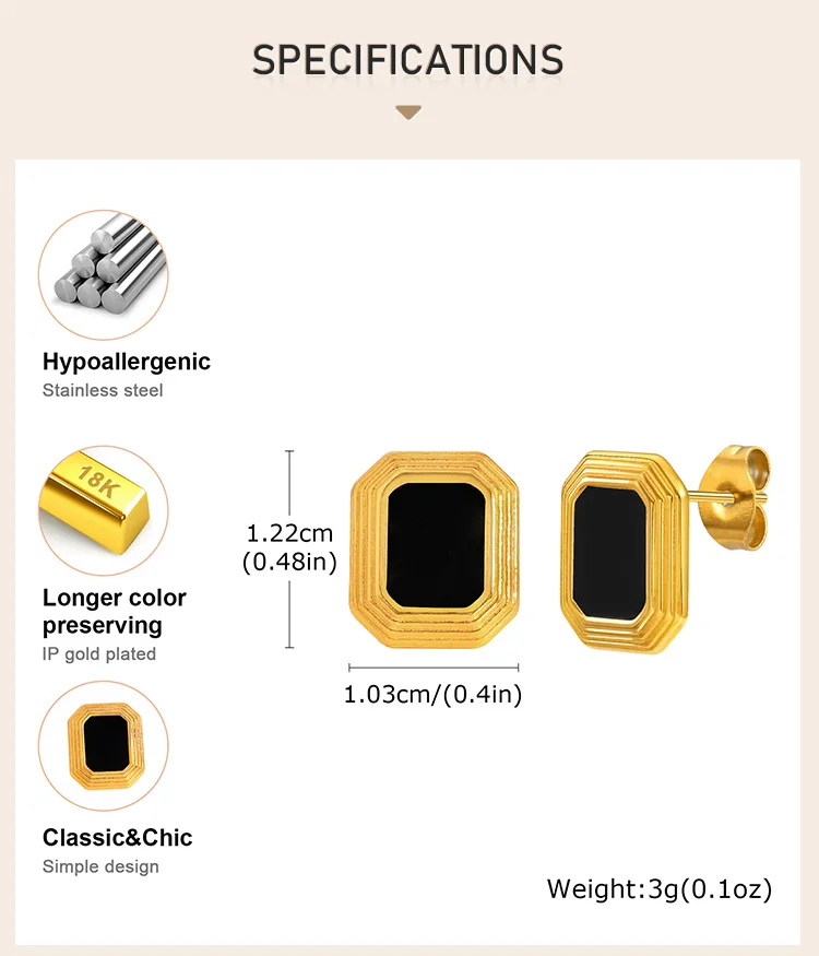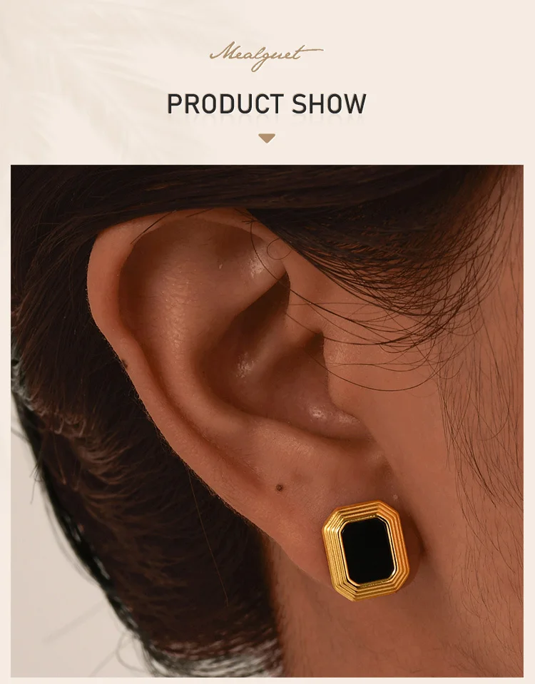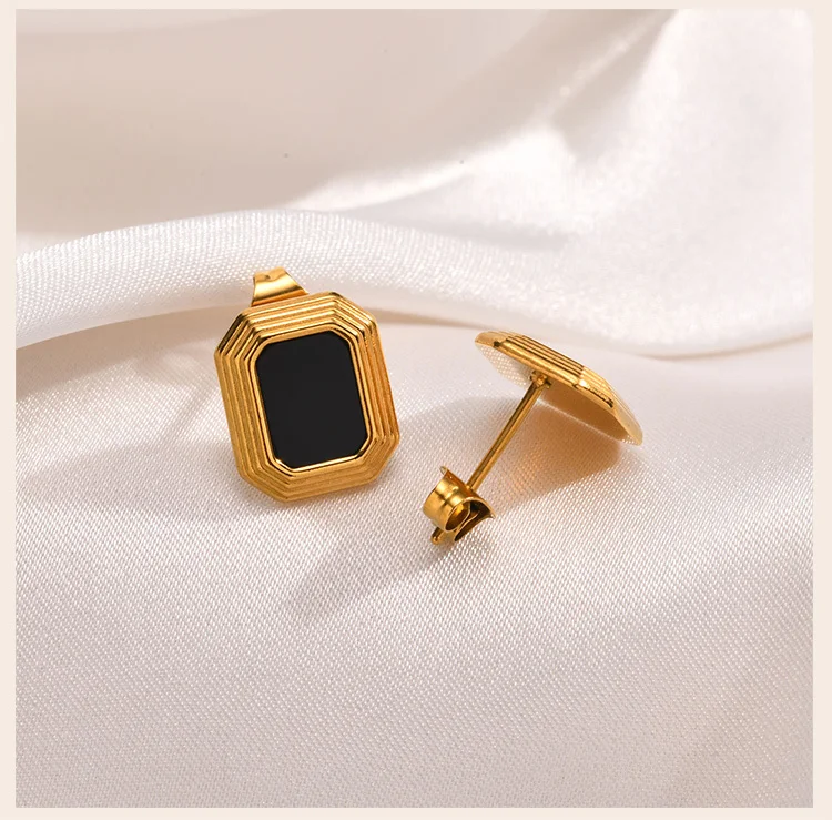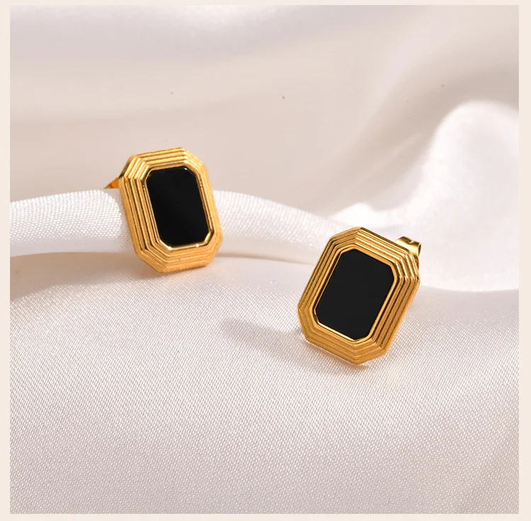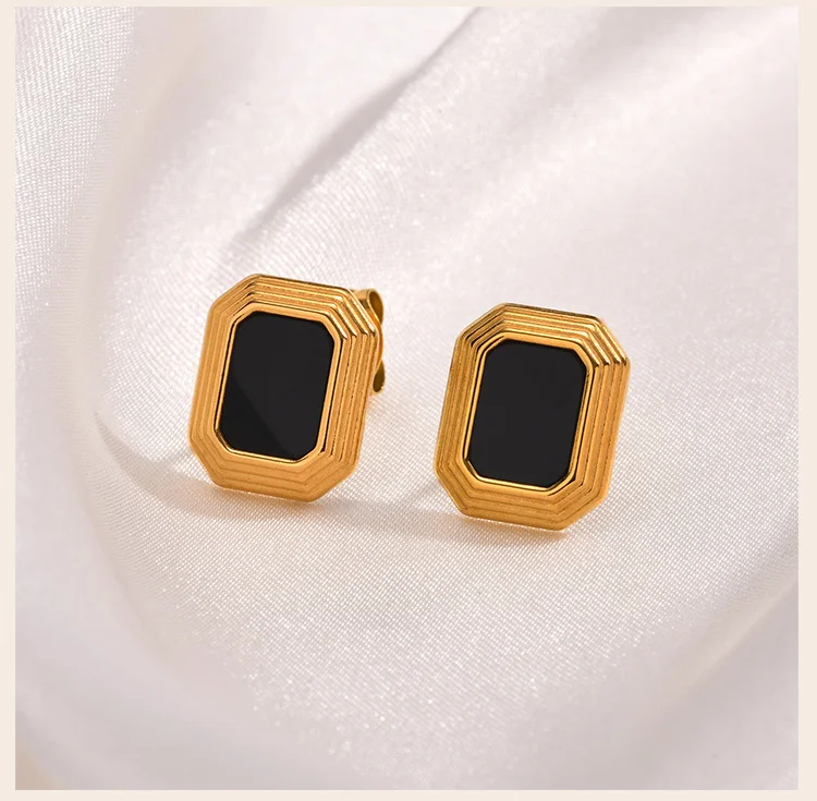 Rectangular Stud Earrings for Women, 18K Gold Plated Statement Earring, Stainless Steel Black Nature Stone Ear Jewelry