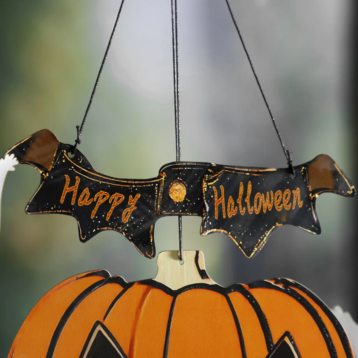 Wooden Halloween Hanging Decor, "Happy Halloween"Banner with Pumpkin Lantern & Ghost Ornaments, Spooky Wall Decor for Home Party